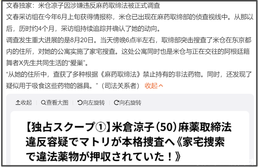 根据文春爆料,他们6月份就注意到米仓凉子涉毒遭调查了,8月份米仓凉子突然失联,原来是住所遭搜查了,从米仓凉子家里查获了多种禁止持有的非法药物,还发现了疑似用于吸食这些药物的器具,基本上实锤了。