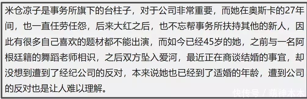 米仓凉子的现任是阿根廷人,为了和现任交往,她干脆和合作二十多年的经纪公司解约了,因为公司阻拦二人在一起。