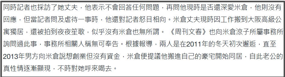 对米仓凉子动手的同时,前夫还住着女方的豪宅、花着女方的钱并出轨。